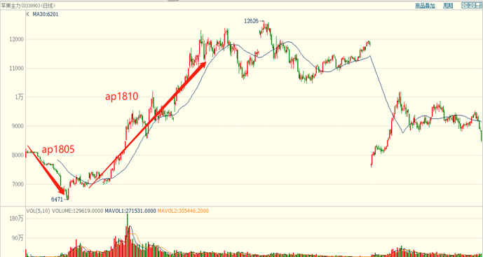 最典型的例子是在18年苹果上市的时候,18年5月份之前,市场交易的主力合约是ap1805,其对应的交割标的是17年收获的苹果,当年苹果是一个丰收年,所以05合约价格一路走低,但于此同时,10合约的苹果确是一路强势上涨,05-10合约之间价差一路拉大,两个合约给人的感觉似乎根本就不是同一个品种。所以我们需要注意的第一个重要特征是 :苹果主力合约05和10之间,具有极大的跳跃性。不能简单的用05 的走势去外推10的走势。这点与工业品差别非常大,比如有色金属,相邻月份之间的走势具有很强的连续性。