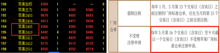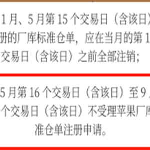 交易所从每年5月份的第16个交易日开始到9月最后一个交易日不受理苹果仓单的注册,是因为新季苹果是9-11月份收获,这样设计,就能有效的防止上一季的苹果进入交割。