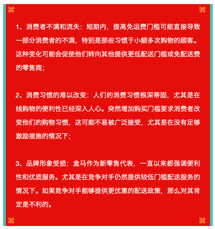 对于习惯于小额频繁购物的消费者来说,提高免配送费门槛无疑增加了他们的购物成本。特别是在盒马的试点城市,这一政策的变化可能会导致一部分消费者转向其他零售品牌。