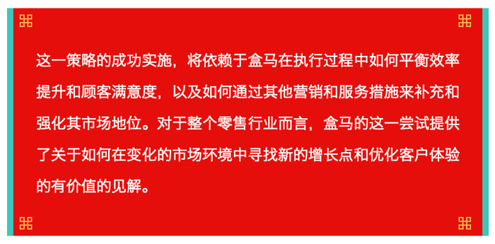 盒马的这一举措可能会促使其他零售商重新考虑他们的定价和服务策略,从而推动整个行业向更高效率和更精细化的运营模式转变。但这也要求盒马必须在保持产品和服务质量的前提下,不断创新和优化其业务模式,以应对日益激烈的市场竞争和消费者需求的多样化。例如,通过提供额外的会员福利、优化购物体验、增加产品种类和质量,或是推出更具吸引力的促销活动,提升品牌价值,从而在长期中稳固并扩大其市场份额。