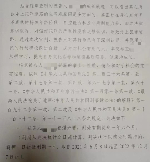一审判决书显示,被告人彭浩犯强奸罪,判处有期徒刑一年六个月。