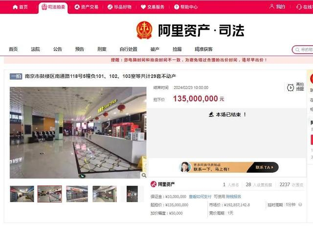 扬子晚报紫牛新闻记者从阿里资产平台获悉,此次拍卖仅有南京麓漫贰号商业管理有限公司报名参加,因此最终以起拍价1.35亿元竞买成功。
