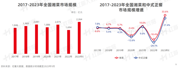 以“费大厨”为代表,湘菜品牌的韧性已清晰地显露出来。据红餐大数据,自2018年以来,湘菜市场规模的增速整体高于中式正餐。疫后复苏第一年,湘菜为餐饮行业带来了一丝暖意。据红餐大数据统计,截至2023年9月,全国湘菜门店数约11.8万家;近一年新增约2750家湘菜馆,而关闭的仅有约600家。