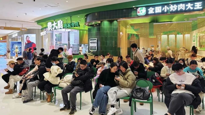 2月14日晚6点50分,北京朝阳大悦城7层,在费大厨辣椒炒肉(以下简称“费大厨”)门外,等位的食客已超过40人。这些食客坐在绿色“候餐椅”上,焦躁地翻划手机,从店内传来的辣椒炒肉香味,让他们按捺不住,不时有人起身去问门口服务员“什么时候到我?”