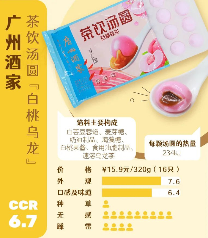 CCCC:汤圆皮有点沙沙的感觉,没有很细腻,白桃乌龙的味道很足,但感觉像香精味,有点发苦。