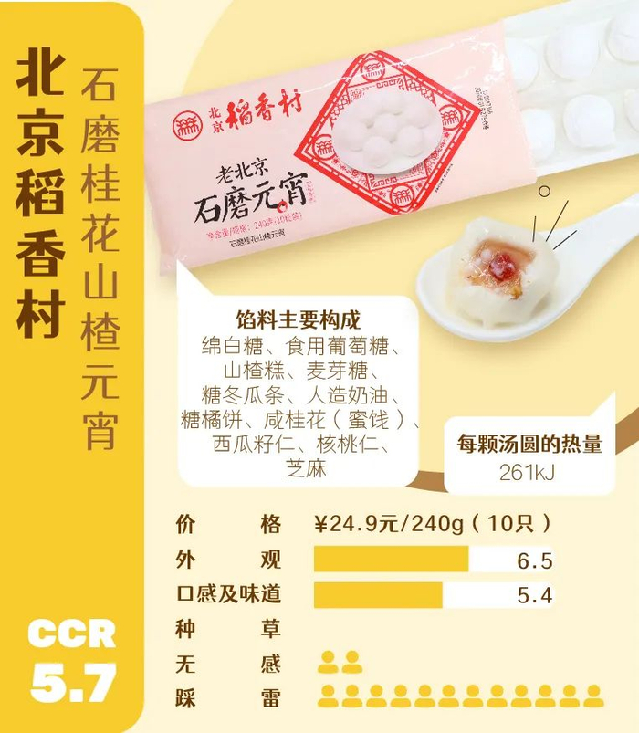 汤圆是“包”出来的,元宵是“滚”出来,北京稻香村石磨桂花山楂元宵是一款混进汤圆里的元宵,在10款汤圆中俨然一个“显眼包”。高情商:有一种浑然天成的手工痕迹;低情商:疙里疙瘩。