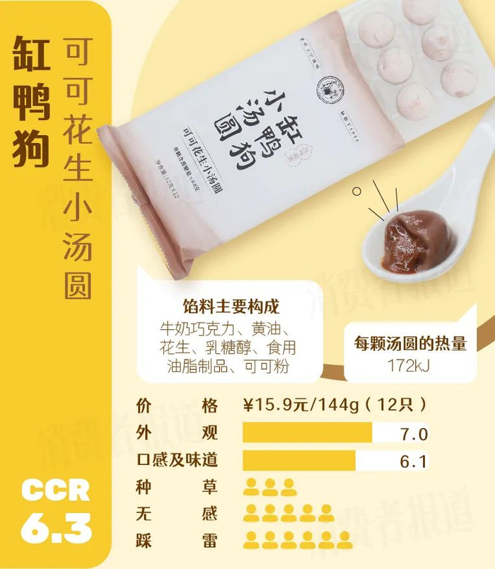 缸鸭狗,一款有技术含量的汤圆,据传其宁波汤团制作技艺是浙江省非物质文化遗产。该款可可花生小汤圆,个头小小,宣称单颗含蔗糖量不超过0.8g,主打一个轻盈无负担。