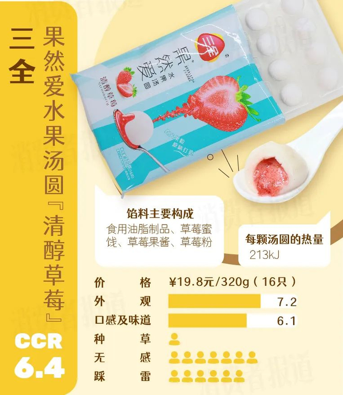 果然爱水果汤圆是郑州三全食品股份有限公司在行业内首推水果口味的系列汤圆,有草莓、蓝莓、奇异果、香橙、黄桃、菠萝等口味,馅料最大的亮点是果肉呈颗粒状,最大限度还原真实水果口感。