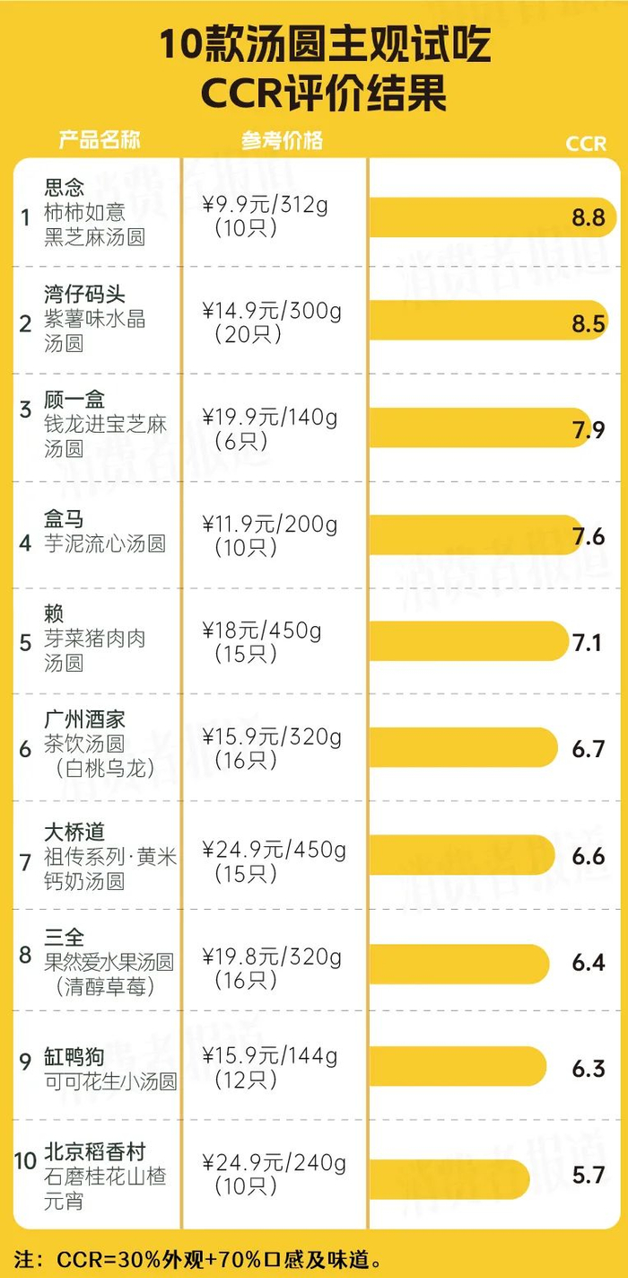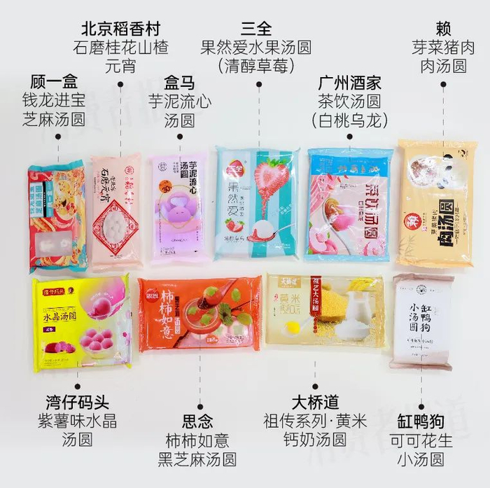 顾一盒钱龙进宝芝麻汤圆、盒马芋泥流心汤圆、思念柿柿如意黑芝麻汤圆、湾仔码头紫薯味水晶汤圆、广州酒家茶饮汤圆(白桃乌龙)、缸鸭狗可可花生小汤圆、芽菜猪肉肉汤圆、三全果然爱水果汤圆(清醇草莓)、大桥道祖传系列·黄米钙奶汤圆、北京稻香村石磨桂花山楂元宵