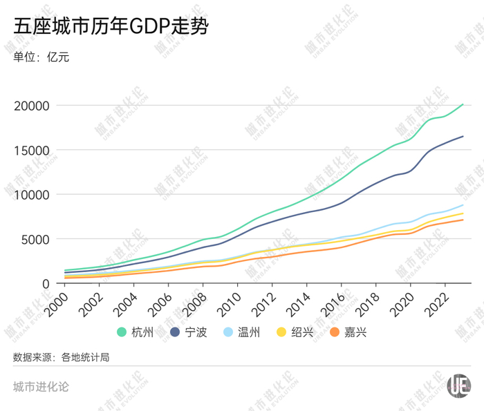 体现在经济体量上,温州不仅被突飞猛进的杭甬“双子星“越甩越远,连身后的绍兴、嘉兴,也凭借离长三角中心更近的区位优势日益逼近。