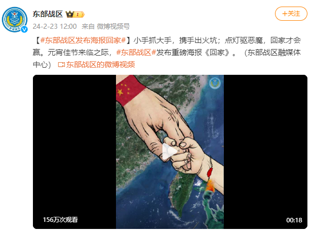 今天(23日)中午12时,东部战区微信公众号及微博发布重磅海报《回家》及相关视频。该内容一经发布,迅速引起岛内媒体的注意,多家台媒对其进行了报道与转发。