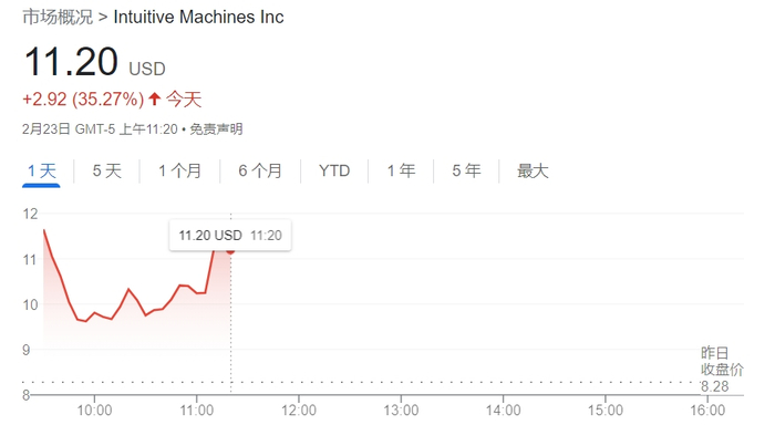 财联社2月24日讯(编辑 牛占林)美东时间周五,美国太空探索公司直觉机器公司(Intuitive Machines)股价盘中飙升逾40%,不过最新略有收窄,目前市值略超10亿美元。此前一天该公司研制的一艘无人驾驶航天器成功降落在月球表面,这是50多年来美国航天器首次登陆月球,也可能是航天行业的一个分水岭时刻。