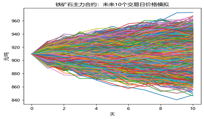 在利用Monte Carlo进行10,000次价格模拟后, 我们可以看到铁矿未来10日价格波动区间在840-970元/吨之间。
