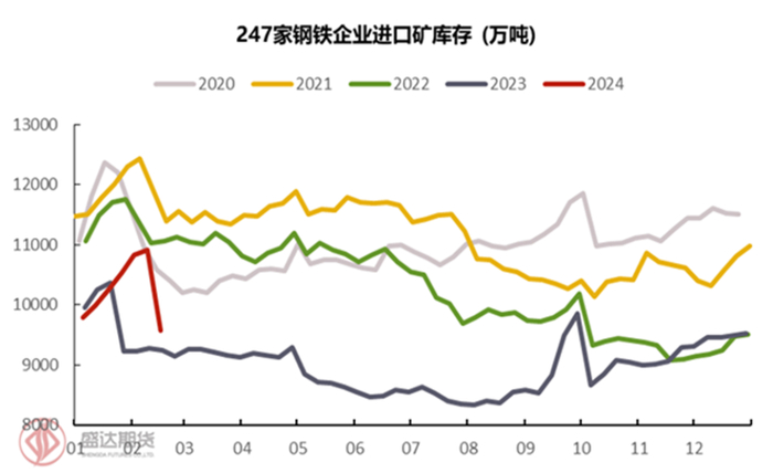 本期45港进口矿库存为13603.39万吨,环比节前增455.55万吨;247家钢厂进口矿库存为9530.96万吨,环比减少37.51万吨。从下图可以看到,此次节中厂库去库斜率为近年最大,在铁水没有明显增量的情况下,较陡峭的厂库去库斜率及港库累库斜率反映出此次钢厂节中没有进行成规模的补库。节后钢厂预计存刚需补库,但受限于需求及不断下降的铁矿价格影响,其短期内补库量预计不大。节后钢厂补库策略预计以逢低补库为主。港库预计三月中旬后开始相对较流畅的去库进程。