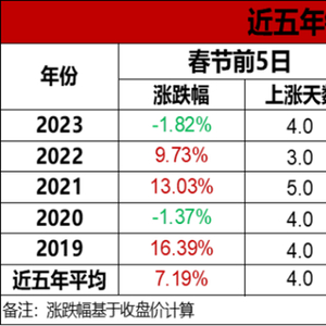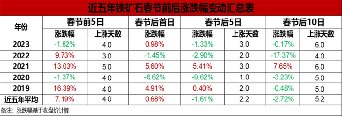 图表1:近五年铁矿石春节前后涨跌幅变动汇总表
