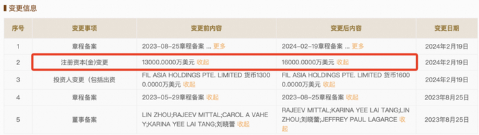 富达基金成立于2021年5月27日,由富达亚洲控股私人有限公司(FILASIA HOLDINGS PTE. LIMITED)100%控股,初始注册资本金为3000万美元,经过2022年两次增资以及2023年、2024年的增资,目前注册资本金已经达到1.6亿美元,相比成立之初增资幅度超过4倍。