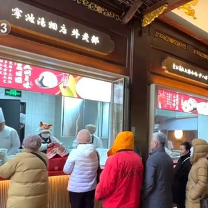 在豫园附近的这家汤团店门前,买汤圆的市民排着长队,店内也坐满了前来吃汤圆的食客。