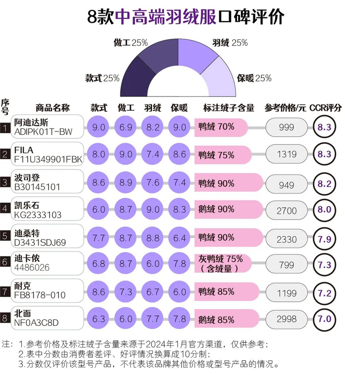 8款中高端羽绒服中,阿迪达斯 ADIPK01T-BW、FILA F11U349901FBK较受消费者认可,CCR评分高达8.3分。