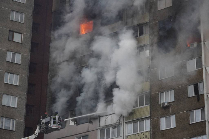 2月7日,消防员在乌克兰基辅为被导弹碎片击中的居民楼灭火。图据新华社