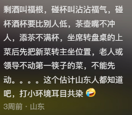 还有最后的三分之一,是山东IP的热心网友,在科普酒桌小tips。并时不时夹带一句疑惑口吻的话,“这不是从小就知道的吗”“这还需要说吗”。