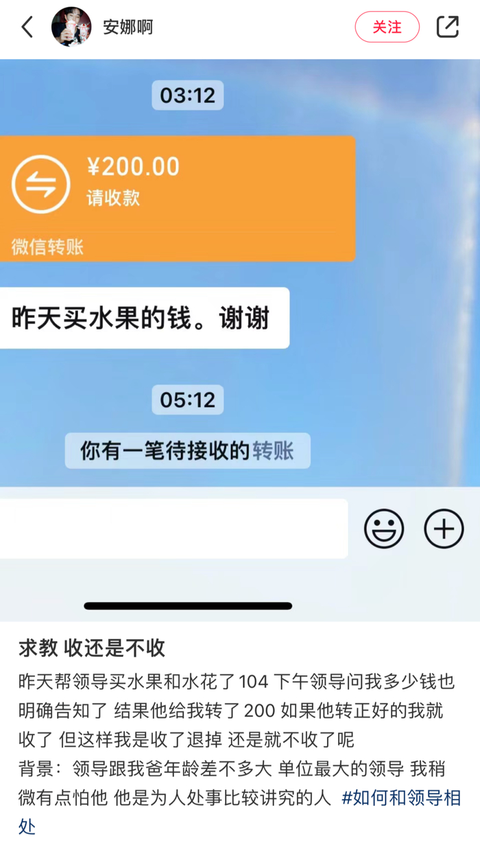 遇到这种情况的清澈年轻人,要么选择跟领导说明白他给多了,心里又会纠结这样显得有点呆板。要不就直接把钱退回去,但会觉得是不是舔得有点过了、没必要。