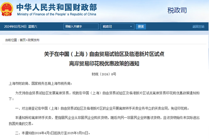 为支持自由贸易试验区发展离岸贸易,现就在中国(上海)自由贸易试验区及临港新片区试点离岸贸易印花税优惠政策通知如下: