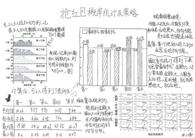 李泓霖同学以数学概率为主要探究工具,辅以电脑编程,提供了详实的数据支撑。他巧妙地运用了数学中的相关概念,从数据的均值、最值、波动等方面进行了深入分析。根据研究,若追求稳定,应选择先抢;而对于那些渴望冲击手气最佳且不惧风险的同学,后抢或许是更好的选择。