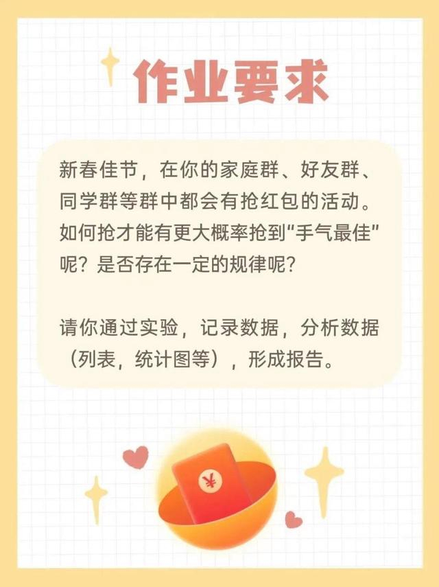 深圳中学龙岗学校数学科组的老师们借助寒假作业,开展了别开生面的“抢红包”PBL项目式探究学习。这份作业不仅考验了同学们丰富的知识储备,更展示出了他们出类拔萃的动手实践能力,让他们在具体情境中加深对数学知识的理解。
