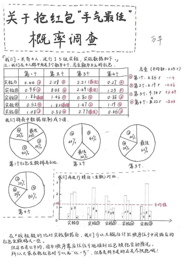 廖云泽同学巧妙地结合了数学统计概率与算法代码,对红包金额分布规律进行了深入研究。通过参考微信抢红包的代码,他得出结论:在3—5人的场景中,第一个抢红包的人成为“手气王”的概率最大;但当人数增多时,越靠后,获得“手气最佳”的概率越高。