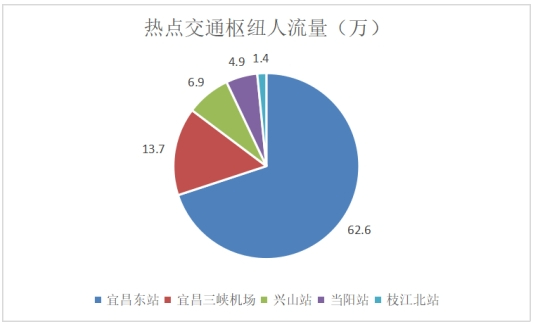 宜昌交通发达,拥有多个火车站,包括宜昌东站、兴山站等,连接了全国各地铁路网。春节期间人流量最高为宜昌东站,人流量峰值出现在2月16日返程期间。