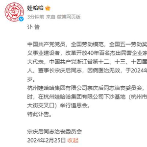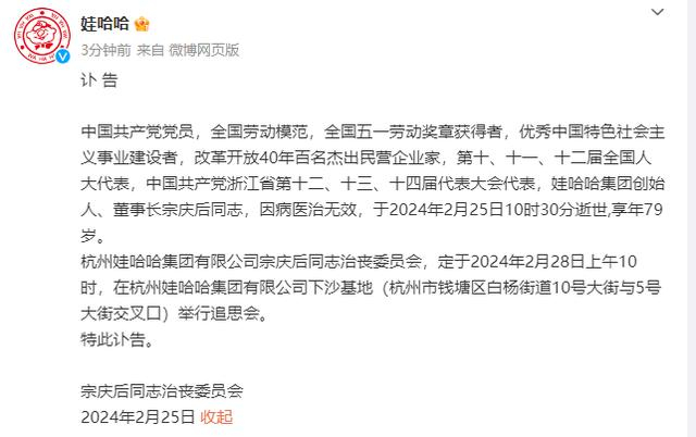 2月25日,娃娃哈发布讣告,娃哈哈集团创始人、董事长宗庆后因病医治无效,于2024年2月25日10时30分逝世,享年79岁。