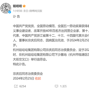 2024年2月25日10时30分杰出民营企业家、娃哈哈集团创始人、董事长宗庆后因病医治无效逝世,享年79岁。