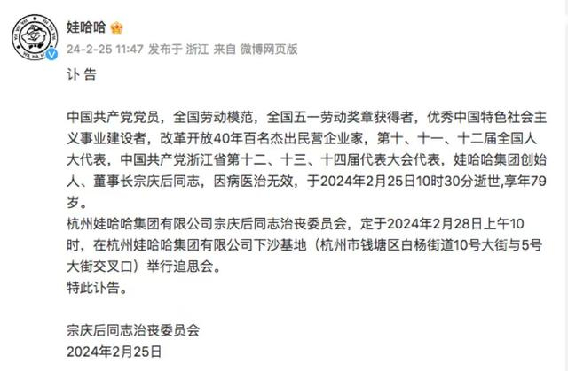 2024年2月25日上午,娃哈哈发布讣告:中国共产党党员,全国劳动模范,全国五一劳动奖章获得者,优秀中国特色社会主义事业建设者,改革开放40年百名杰出民营企业家,第十、十一、十二届全国人大代表,中国共产党浙江省第十二、十三、十四届代表大会代表,娃哈哈集团创始人、董事长宗庆后同志,因病医治无效,于2024年2月25日10时30分逝世,享年79岁。