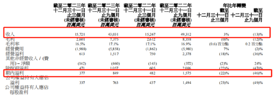 如果把时间线拉长,截至2023年12月31日止9个月,联想集团2023/24财年前三季度累计营收43031百万美元,较去年同期49312百万美元同比下滑13%;期内溢利累计849百万美元,较去年同期1575百万美元同比下滑46%,降幅明显。