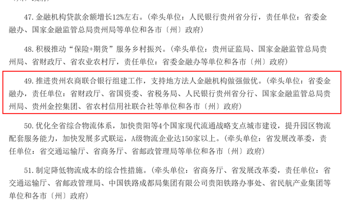 2月26日,依据贵州省人民政府办公厅发布的《2024年〈政府工作报告〉重点工作责任分工方案》,财联社记者发现,上述文件的第二大部分“全力建设现代化产业体系”中的第三个小节“大力发展生产性服务业”中的第49项内容,即为“推进贵州农商联合银行组建工作,支持地方法人金融机构做强做优”。