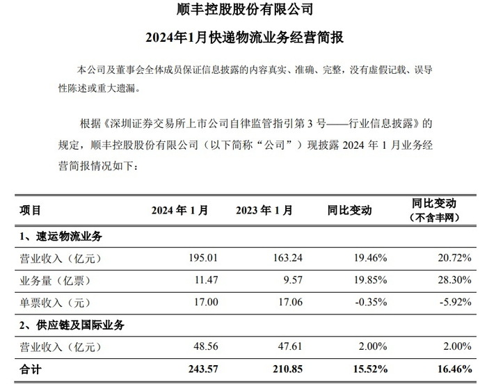 近日,顺丰控股发布2024年1月快递物流业务经营简报。顺丰控股2024年1月速运物流业务、供应链及国际业务合计收入为243.57亿元,同比增长15.52%,不含丰网同比增长16.46%。