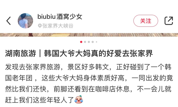 “韩国大爷大妈真的好爱去张家界”、“走几步路就能看见韩国旅行团”、“不仅景区随处可见韩语标识,就连张家界机场导览牌也配有韩语翻译”,界面新闻记者以张家界旅游为关键词在小红书、微博等社交媒体搜索,发现“韩国”一词高频出现在游客分享帖中。