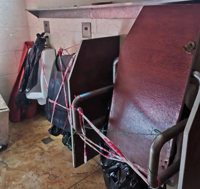 旅游公厕设施损坏及放置的水桶。