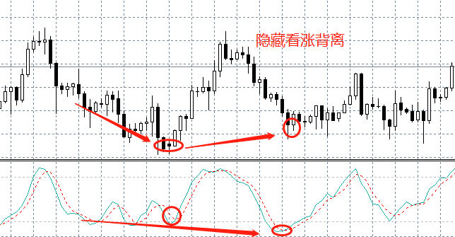隐藏背离指的是指标持续走低或走高,但市场价格反而出现更高的低点或更低的高点。