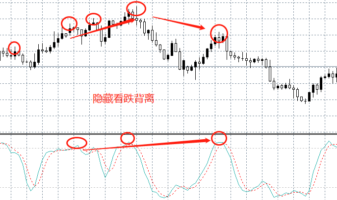隐藏看跌背离:价格形成一个更低的高点,但指标持续走高。