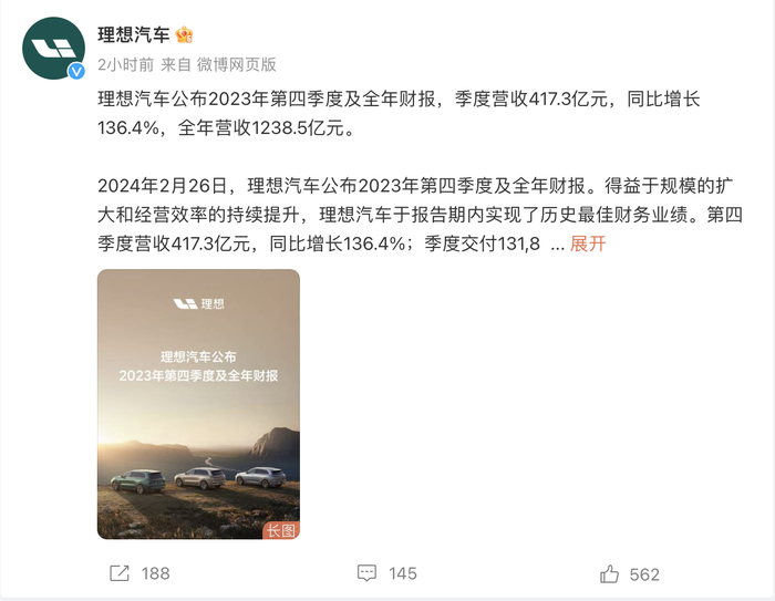 北京时间2月26日美股盘前,理想汽车公布2023年第四季度及全年财报,季度营收417.3亿元,同比增长136.4%,全年营收1238.5亿元。