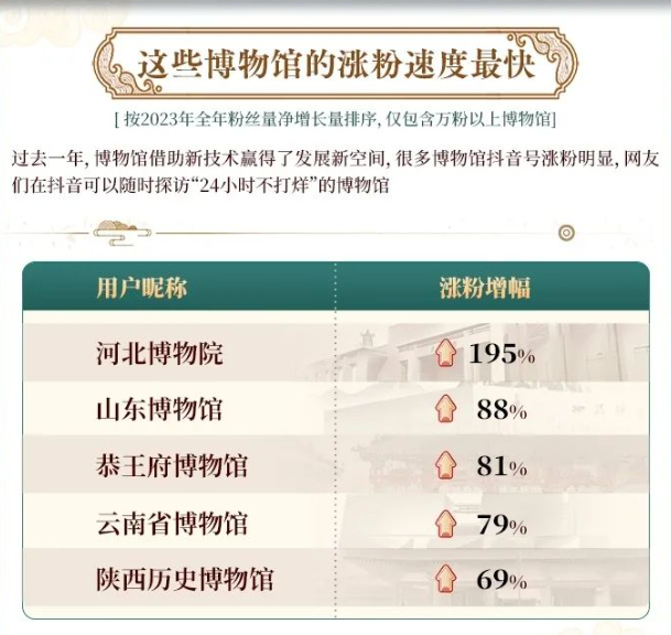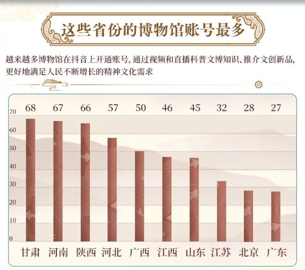 近日,抖音联合中国文物报发布《古风新韵·博物馆在抖音上的这一年》数据报告。数据显示,过去一年,抖音博物馆相关内容播放量达 1210 亿,互动量超过 28 亿。截至2023年底,认证为政务号和机构号的博物馆已有 729 家,覆盖历史、文化、艺术、军事、科技等多个领域。其中,甘肃、河南、陕西三省的博物馆抖音账号数量最多。河北博物院、山东博物馆、恭王府博物馆等博物馆抖音号涨粉最明显,涨幅均在 80% 以上。