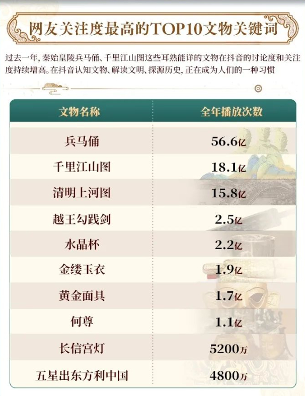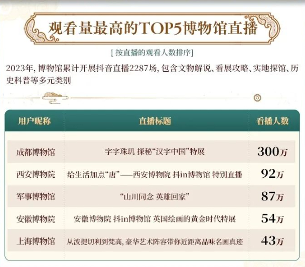 在抖音认知文物、解读文明、探源历史,正在成为人们的一种习惯。2023年,博物馆累计开展抖音直播2287场,包含文物解说、看展攻略、实地探馆、历史科普等多元类别。其中,成都博物馆、西安博物院、军事博物馆、安徽博物馆、上海博物馆开展的抖音直播观看人次位居博物馆直播前5位。过去一年,秦始皇陵兵马俑、千里江山图、清明上河图、越王勾践剑这些大家耳熟能详的文物在抖音的关注度持续增高。