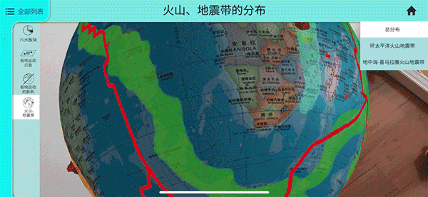 中国地理一套中,配备的【AR地理探索】软件,光看目录,从面到点、由浅入深,分为五大模板:全景中国、中国地理、世界地理、地球地理、自然地理。