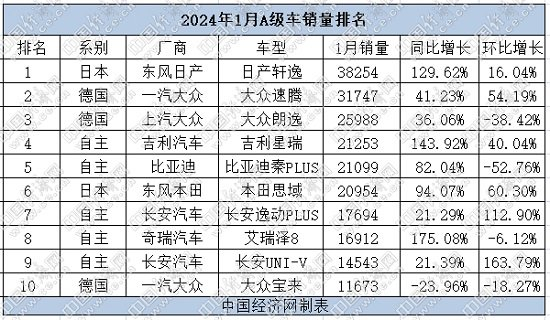 1月A级车:自主占据半壁江山,秦PLUS跌出前三