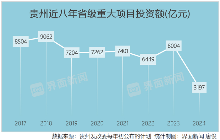 界面新闻记者查询历史数据发现,自2017年来,贵州省发改委每年初公布的省级重大项目计划投资额基本都在7000亿元以上,并且2018年时最高超过了9000亿元。今年的计划投资额是近8年的最低值,且大幅低于过去几年的水平。