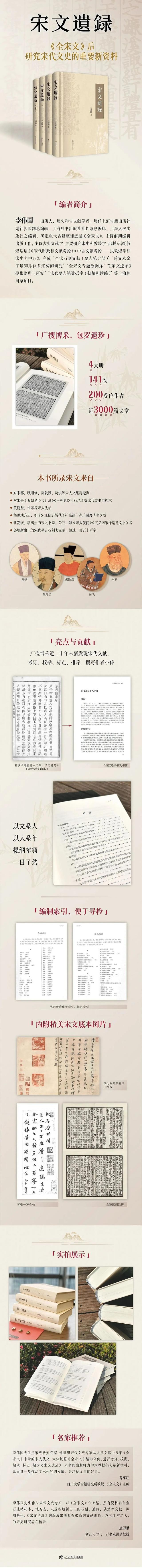 《宋文遗录》是从宋人文集、宋代史籍、宋元明方志、宋人法书、宋代墓志碑刻,以及新发现和新出土的文献中,辑录《全宋文》未收集或已收但有较大差异之宋人文章,共计近三千篇,加以考订、校勘、排序、标点,撰写作者小传,按时代、作者和文体编排,分为一百四十一卷,近三百万字,是对《全宋文》的重要补充。下文为本书编者李伟国先生所撰,讲述了编纂《宋文遗录》背后的故事。