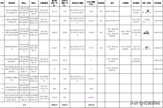 另据报道,相关生效判决、执行裁定等材料显示,至少有4笔经诉讼确定的债务总额为6954.63万元。而企业统计认为,另有项目欠款15247.66万元,即六盘水市水城区政府共欠企业约2.2亿元。而地方政府一份汇报文件则承认有9000余万元欠款。