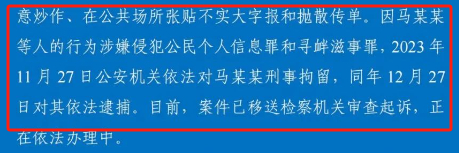 到了2023年年末,马艺珈伊也被地方公安以涉嫌寻衅滋事罪刑事拘留。