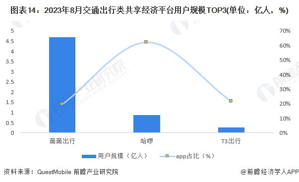 交通出行类共享平台中,据QuestMobile数据显示,2023年8月,滴滴出行、哈啰、T3出行去重用户分别为4.68亿、0.87亿、0.27亿,用户在APP的活跃度相较于小程序占比分别为19.5%、62.2%、21.5%。